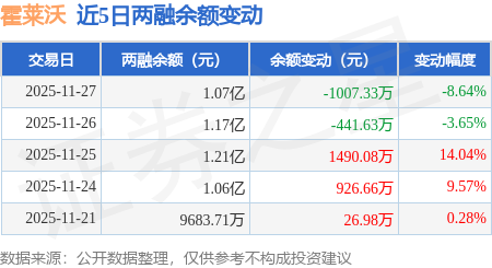 证券之星消息,11月27日,霍莱沃(688682)融资买入1403.85万元,融资偿还2411.18万元,融资净卖出1007.33万元,融资余额1.07亿元,近20个交易日中有11个交易日出现融资净买入。