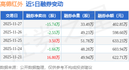 证券之星消息,11月27日,高德红外(002414)融资买入2322.23万元,融资偿还3837.05万元,融资净卖出1514.82万元,融资余额10.55亿元。