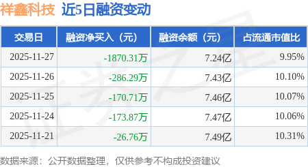 证券之星消息,11月27日,祥鑫科技(002965)融资买入2706.57万元,融资偿还4576.88万元,融资净卖出1870.31万元,融资余额7.24亿元。
