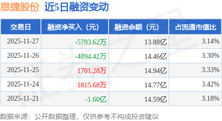 证券之星消息,11月27日,恩捷股份(002812)融资买入1.14亿元,融资偿还1.72亿元,融资净卖出5793.62万元,融资余额13.88亿元。