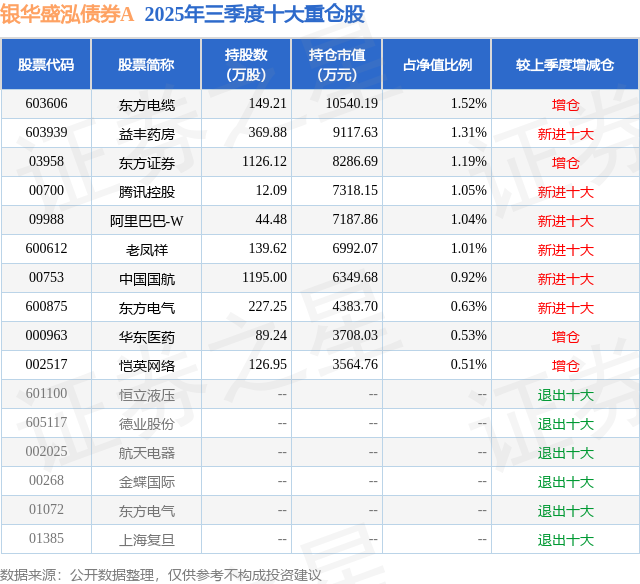 根据2025基金Q3季报公募基金重仓股数据,重仓该股的公募基金共5家,其中持有数量最多的公募基金为银华基金的银华盛泓债券A。银华盛泓债券A目前规模为36.78亿元,最新净值1.0924(11月27日),较上一交易日下跌0.03%,近一年上涨7.82%。该公募基金现任基金经理为阚磊 于蕾 李程。阚磊在任的基金产品包括:银华安盈短债债券A,管理时间为2023年8月11日至今,期间收益率为5.88%;银华安丰中短期政策性金融债债券A,管理时间为2023年8月11日至今,期间收益率为7.58%;银华岁丰定期开放债券发起式,管理时间为2023年9月22日至今,期间收益率为8.29%;银华致淳债券,管理时间为2023年12月21日至今,期间收益率为6.69%。于蕾在任的基金产品包括:银华钰祥债券A,管理时间为2025年8月21日至今,期间收益率为1.7%;银华盛安六个月持有混合A,管理时间为2025年11月22日至今,期间收益率为nan%。李程在任的基金产品包括:银华汇盈一年持有期混合A,管理时间为2025年4月3日至今,期间收益率为3.88%;银华招利一年持有期混合A,管理时间为2025年4月3日至今,期间收益率为9.07%;银华钰祥债券A,管理时间为2025年8月22日至今,期间收益率为1.55%。
