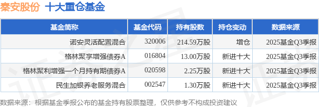 根据2025基金Q3季报公募基金重仓股数据,重仓该股的公募基金共4家,其中持有数量最多的公募基金为诺安基金的诺安灵活配置混合。诺安灵活配置混合目前规模为8.31亿元,最新净值3.401(11月27日),较上一交易日上涨0.09%,近一年上涨27.28%。该公募基金现任基金经理为刘晓飞。刘晓飞在任的基金产品包括:诺安恒鑫混合,管理时间为2022年11月12日至今,期间收益率为28.26%;