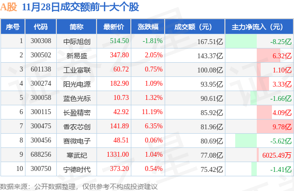 当日A股成交额前10大个股中9只个股收涨,平均涨幅2.71%,其中中际旭创(300308)以成交额167.51亿元排第一。从主力资金流入看,成交额前10大个股中有6只个股呈现主力资金净流入。