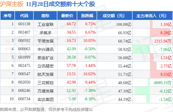 当日沪深主板成交额前10大个股中6只个股收涨,平均涨幅4.9%,其中工业富联(601138)以成交额100.08亿元排第一。从主力资金流入看,成交额前10大个股中有6只个股呈现主力资金净流入。