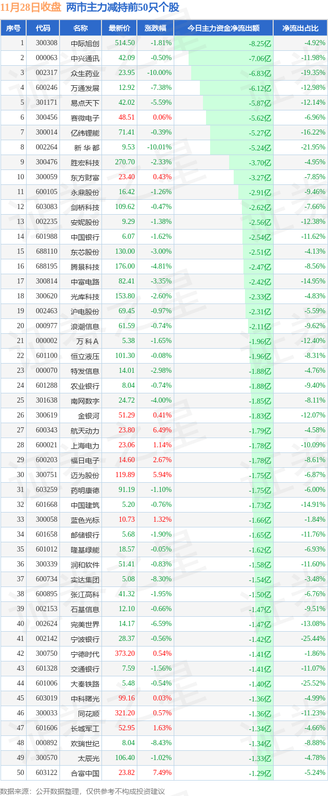 两市主力减持最多的前十只个股为: