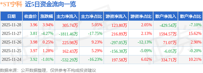 证券之星消息,截至2025年11月28日收盘,*ST宁科(600165)报收于3.96元,上涨3.94%,换手率2.27%,成交量15.55万手,成交额6053.04万元。