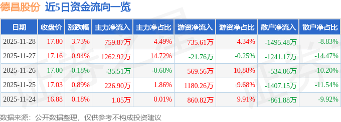 11月28日的资金流向数据方面,主力资金净流入759.87万元,占总成交额4.49%,游资资金净流入735.61万元,占总成交额4.34%,散户资金净流出1495.48万元,占总成交额8.83%。