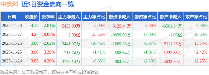 证券之星消息,截至2025年11月28日收盘,中安科(600654)报收于4.15元,下跌2.81%,换手率11.52%,成交量266.79万手,成交额10.87亿元。