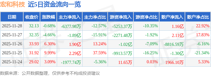 证券之星消息,截至2025年11月28日收盘,宏和科技(603256)报收于32.13元,下跌0.68%,换手率1.8%,成交量15.8万手,成交额5.08亿元。