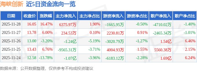 证券之星消息,截至2025年11月28日收盘,海峡创新(300300)报收于16.05元,上涨16.47%,换手率33.8%,成交量225.4万手,成交额33.53亿元。