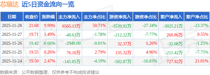 证券之星消息,截至2025年11月28日收盘,芯瑞达(002983)报收于21.68元,上涨9.99%,涨停,换手率4.72%,成交量6.05万手,成交额1.29亿元。