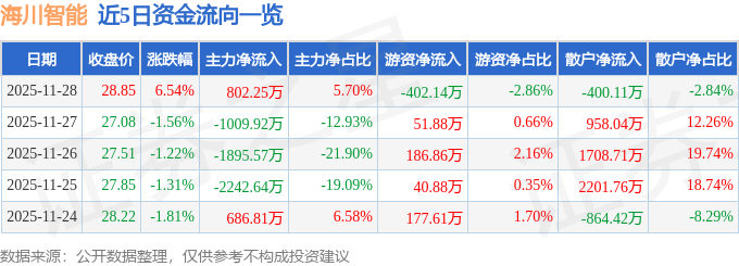 证券之星消息,截至2025年11月28日收盘,海川智能(300720)报收于28.85元,上涨6.54%,换手率2.87%,成交量5.01万手,成交额1.41亿元。