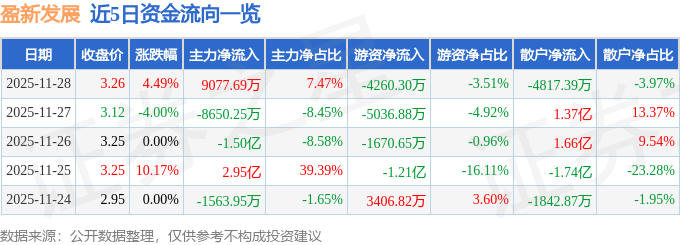 证券之星消息,截至2025年11月28日收盘,盈新发展(000620)报收于3.26元,上涨4.49%,换手率8.16%,成交量381.41万手,成交额12.15亿元。