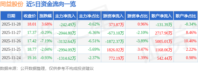 证券之星消息,截至2025年11月28日收盘,同益股份(300538)报收于18.01元,上涨3.68%,换手率17.9%,成交量21.65万手,成交额3.91亿元。
