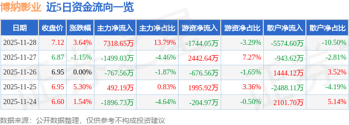 证券之星消息,截至2025年11月28日收盘,博纳影业(001330)报收于7.12元,上涨3.64%,换手率5.5%,成交量75.63万手,成交额5.31亿元。