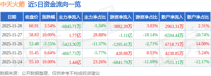 证券之星消息,截至2025年11月28日收盘,中天火箭(003009)报收于60.91元,上涨3.54%,换手率13.65%,成交量21.21万手,成交额12.81亿元。