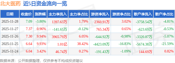 证券之星消息,截至2025年11月28日收盘,北大医药(000788)报收于7.09元,下跌3.8%,换手率18.65%,成交量111.12万手,成交额7.82亿元。