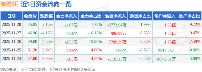证券之星消息,截至2025年11月28日收盘,值得买(300785)报收于45.95元,下跌2.15%,换手率24.47%,成交量29.93万手,成交额13.91亿元。