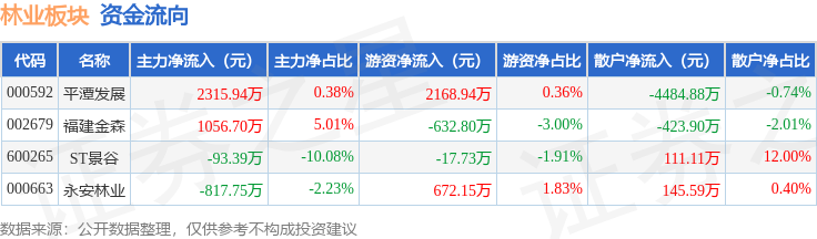 从资金流向上来看,当日林业板块主力资金净流入2461.5万元,游资资金净流入2190.57万元,散户资金净流出4652.07万元。林业板块个股资金流向见下表: