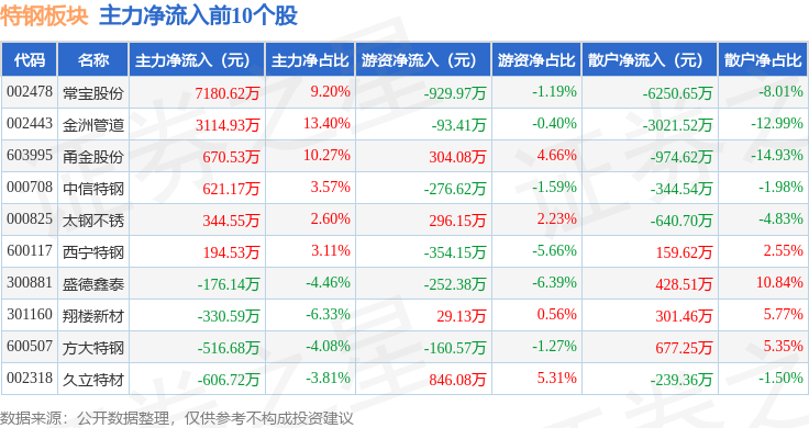 从资金流向上来看,当日特钢板块主力资金净流入6268.46万元,游资资金净流入494.97万元,散户资金净流出6763.43万元。特钢板块个股资金流向见下表: