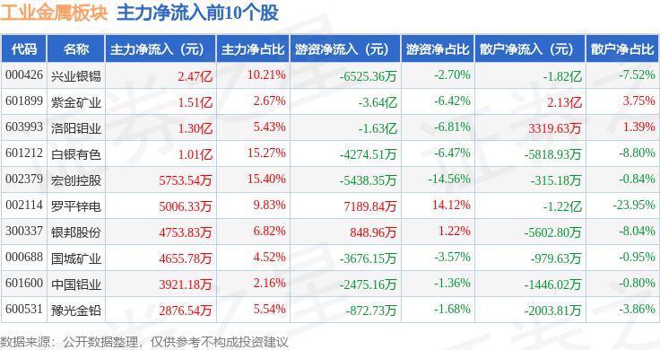 从资金流向上来看,当日工业金属板块主力资金净流入9.55亿元,游资资金净流出8.75亿元,散户资金净流出8001.96万元。工业金属板块个股资金流向见下表: