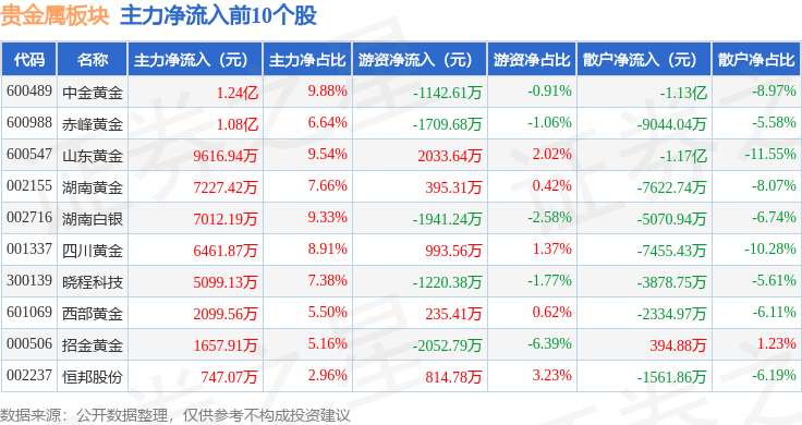 从资金流向上来看,当日贵金属板块主力资金净流入6.36亿元,游资资金净流出3961.02万元,散户资金净流出5.97亿元。贵金属板块个股资金流向见下表: