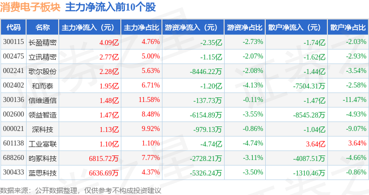 从资金流向上来看,当日消费电子板块主力资金净流入10.05亿元,游资资金净流出9.93亿元,散户资金净流出1173.15万元。消费电子板块个股资金流向见下表: