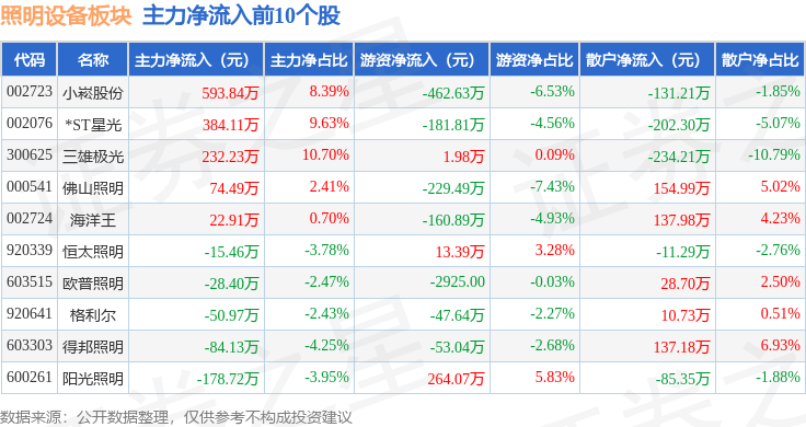 从资金流向上来看,当日照明设备板块主力资金净流出1917.6万元,游资资金净流入1178.62万元,散户资金净流入738.99万元。照明设备板块个股资金流向见下表: