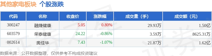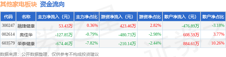 从资金流向上来看,当日其他家电板块主力资金净流出748.89万元,游资资金净流出267.41万元,散户资金净流入1016.3万元。其他家电板块个股资金流向见下表: