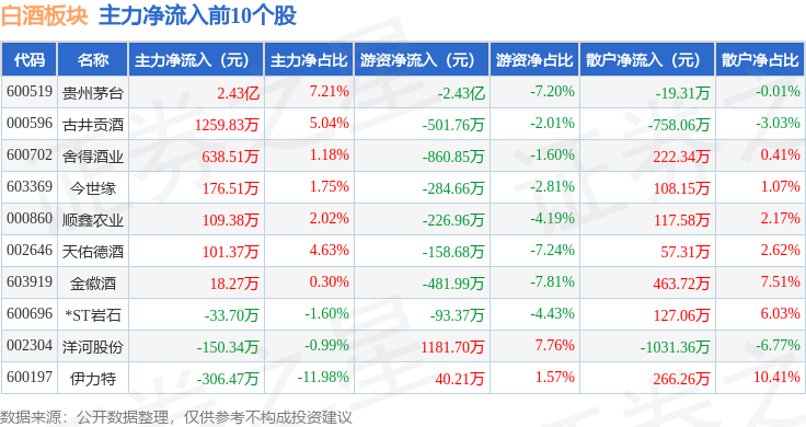 从资金流向上来看,当日白酒板块主力资金净流入1.22亿元,游资资金净流出2.24亿元,散户资金净流入1.03亿元。白酒板块个股资金流向见下表: