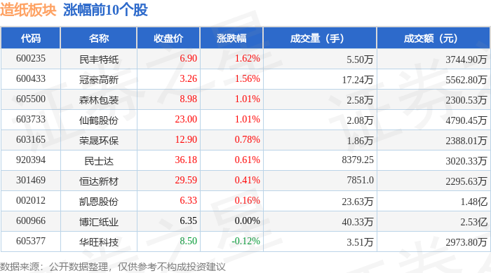 证券之星消息,11月28日造纸板块较上一交易日下跌0.38%,恒丰纸业领跌。当日上证指数报收于3888.6,上涨0.34%。深证成指报收于12984.08,上涨0.85%。造纸板块个股涨跌见下表: