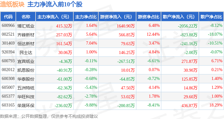 从资金流向上来看,当日造纸板块主力资金净流出4.36亿元,游资资金净流入1.35亿元,散户资金净流入3.01亿元。造纸板块个股资金流向见下表: