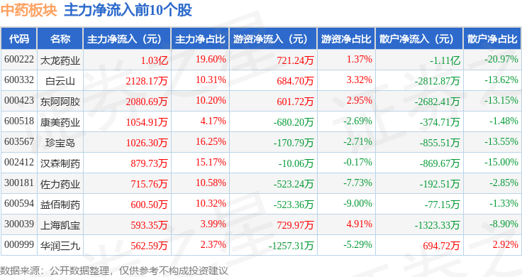 从资金流向上来看,当日中药板块主力资金净流出9.81亿元,游资资金净流入2.15亿元,散户资金净流入7.66亿元。中药板块个股资金流向见下表: