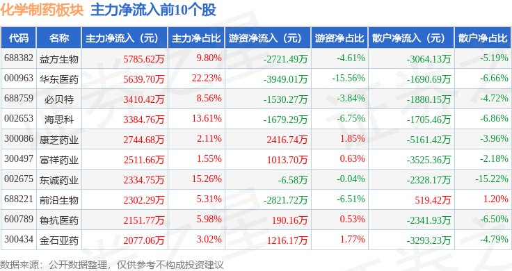 从资金流向上来看,当日化学制药板块主力资金净流出5.99亿元,游资资金净流入2.22亿元,散户资金净流入3.77亿元。化学制药板块个股资金流向见下表: