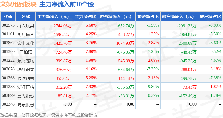 从资金流向上来看,当日文娱用品板块主力资金净流出727.64万元,游资资金净流出2531.63万元,散户资金净流入3259.27万元。文娱用品板块个股资金流向见下表: