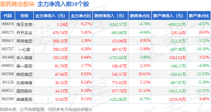 从资金流向上来看,当日医药商业板块主力资金净流出2.28亿元,游资资金净流出2472.38万元,散户资金净流入2.52亿元。医药商业板块个股资金流向见下表: