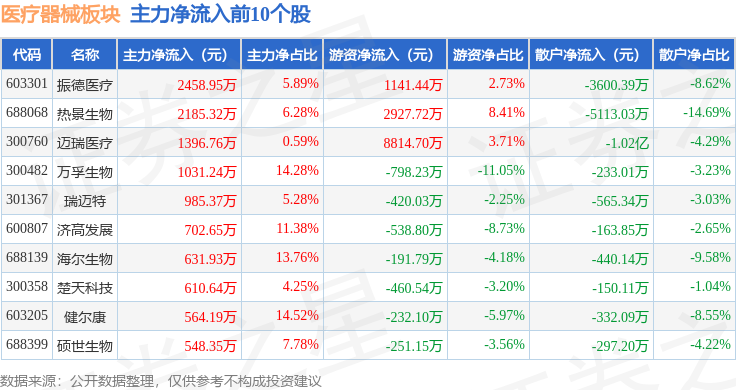 从资金流向上来看,当日医疗器械板块主力资金净流出1.73亿元,游资资金净流入1.57亿元,散户资金净流入1555.9万元。医疗器械板块个股资金流向见下表:
