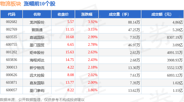证券之星消息,11月28日物流板块较上一交易日上涨0.19%,龙洲股份领涨。当日上证指数报收于3888.6,上涨0.34%。深证成指报收于12984.08,上涨0.85%。物流板块个股涨跌见下表: