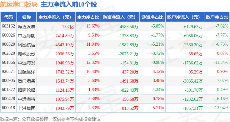 从资金流向上来看,当日航运港口板块主力资金净流入3.18亿元,游资资金净流出2104.64万元,散户资金净流出2.97亿元。航运港口板块个股资金流向见下表: