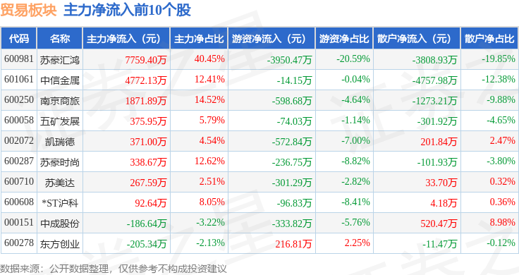 从资金流向上来看,当日贸易板块主力资金净流入1.36亿元,游资资金净流出4184.26万元,散户资金净流出9464.43万元。贸易板块个股资金流向见下表: