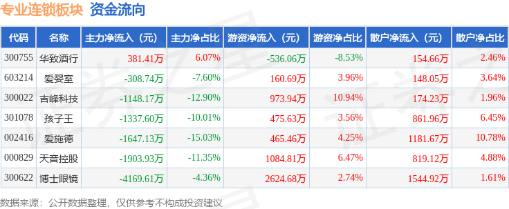 从资金流向上来看,当日专业连锁板块主力资金净流出1.01亿元,游资资金净流入5249.15万元,散户资金净流入4884.61万元。专业连锁板块个股资金流向见下表: