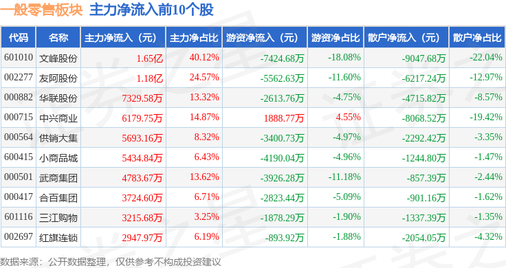 从资金流向上来看,当日一般零售板块主力资金净流入7.59亿元,游资资金净流出4.51亿元,散户资金净流出3.08亿元。一般零售板块个股资金流向见下表: