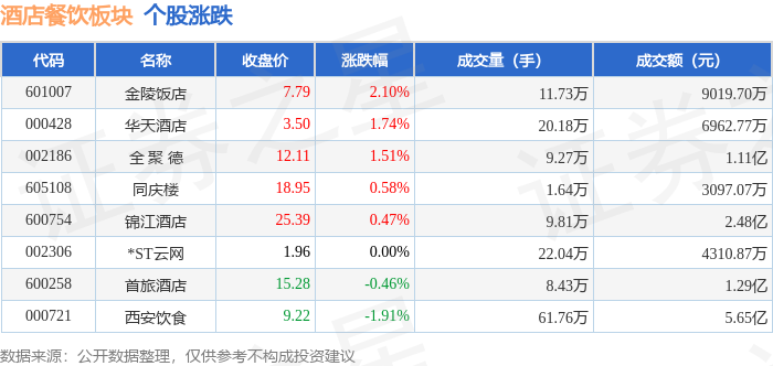 证券之星消息,11月28日酒店餐饮板块较上一交易日上涨0.22%,金陵饭店领涨。当日上证指数报收于3888.6,上涨0.34%。深证成指报收于12984.08,上涨0.85%。酒店餐饮板块个股涨跌见下表:
