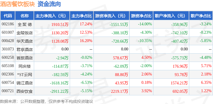 从资金流向上来看,当日酒店餐饮板块主力资金净流出660.97万元,游资资金净流入208.19万元,散户资金净流入452.78万元。酒店餐饮板块个股资金流向见下表: