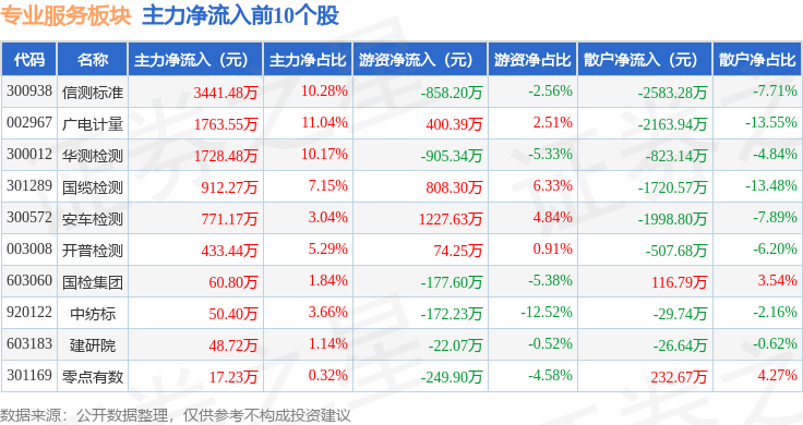 从资金流向上来看,当日专业服务板块主力资金净流出3095.23万元,游资资金净流入1844.2万元,散户资金净流入1251.02万元。专业服务板块个股资金流向见下表: