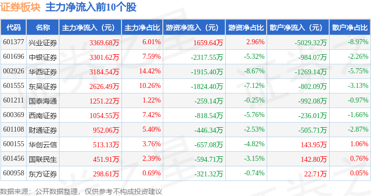 从资金流向上来看,当日证券板块主力资金净流出7.59亿元,游资资金净流入1.3亿元,散户资金净流入6.29亿元。证券板块个股资金流向见下表: