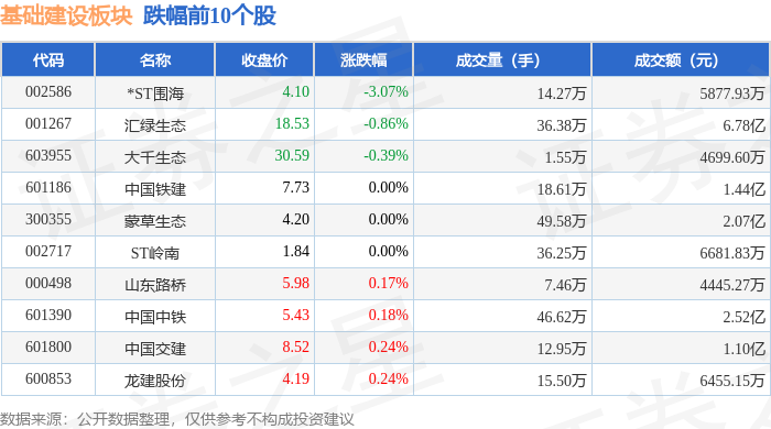 从资金流向上来看,当日基础建设板块主力资金净流入7227.86万元,游资资金净流出2.04亿元,散户资金净流入1.32亿元。基础建设板块个股资金流向见下表:
