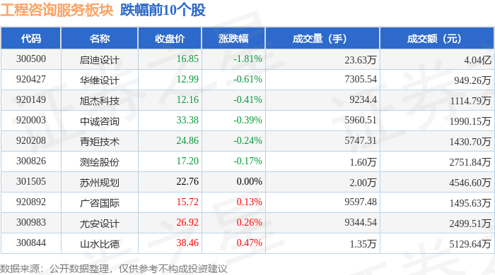 从资金流向上来看,当日工程咨询服务板块主力资金净流入2.28亿元,游资资金净流出1.2亿元,散户资金净流出1.08亿元。工程咨询服务板块个股资金流向见下表: