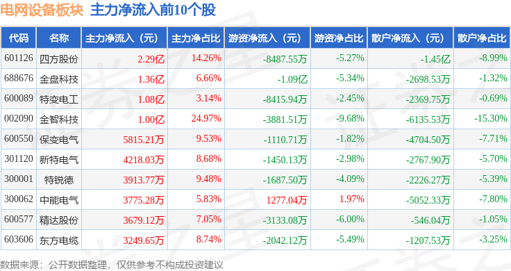 从资金流向上来看,当日电网设备板块主力资金净流入7.97亿元,游资资金净流出6.02亿元,散户资金净流出1.95亿元。电网设备板块个股资金流向见下表: