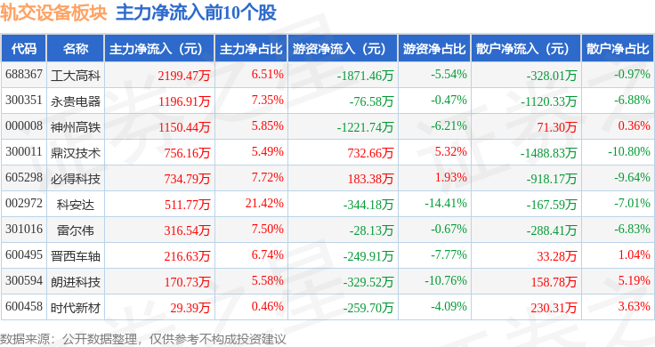 从资金流向上来看,当日轨交设备板块主力资金净流出3412.16万元,游资资金净流出4216.01万元,散户资金净流入7628.17万元。轨交设备板块个股资金流向见下表: